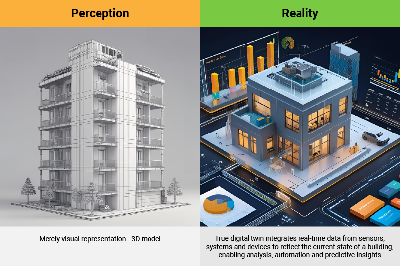 One of the most widespread misunderstandings is that a digital twin is merely a visual representation — a fancy 3D model of a building or asset.